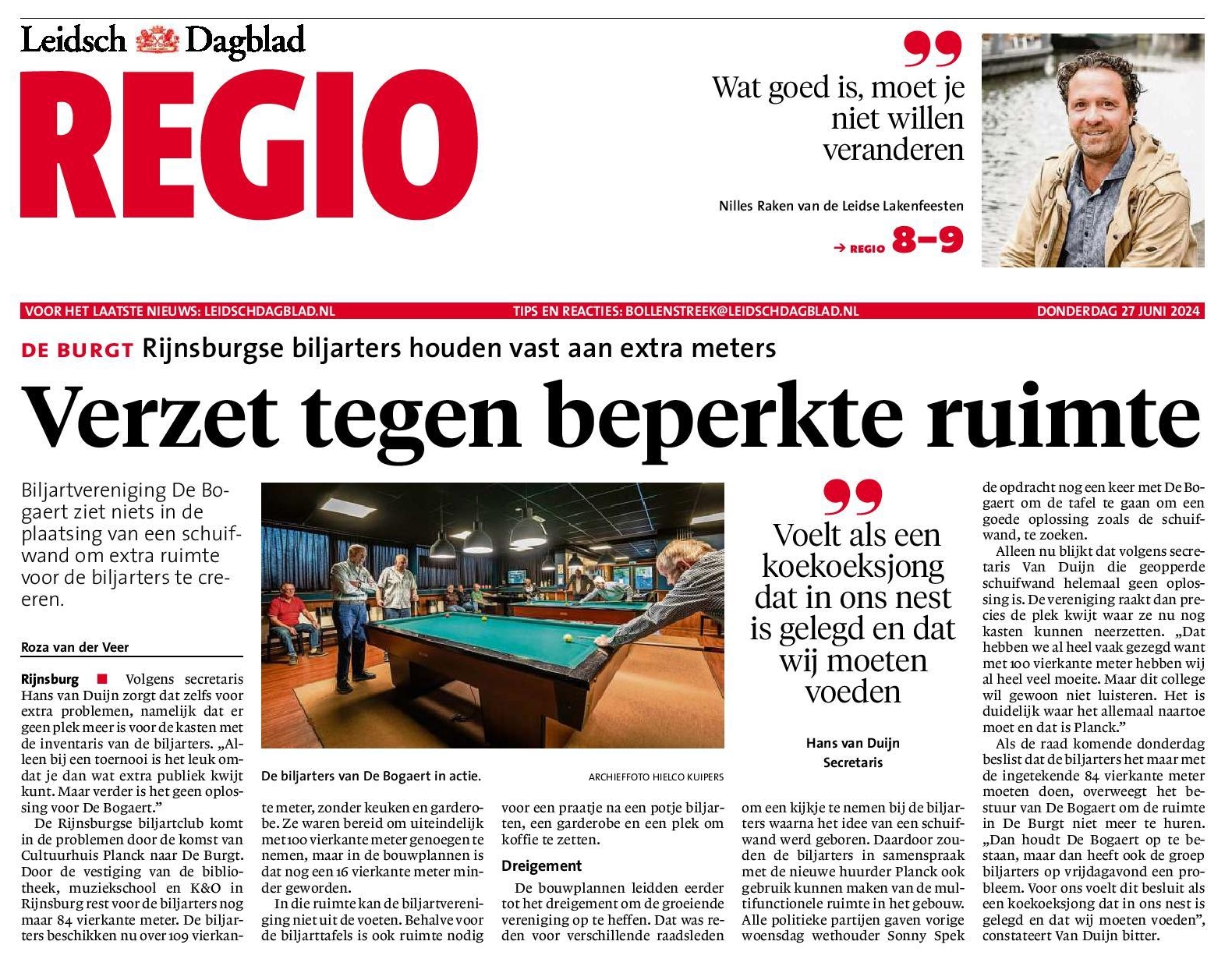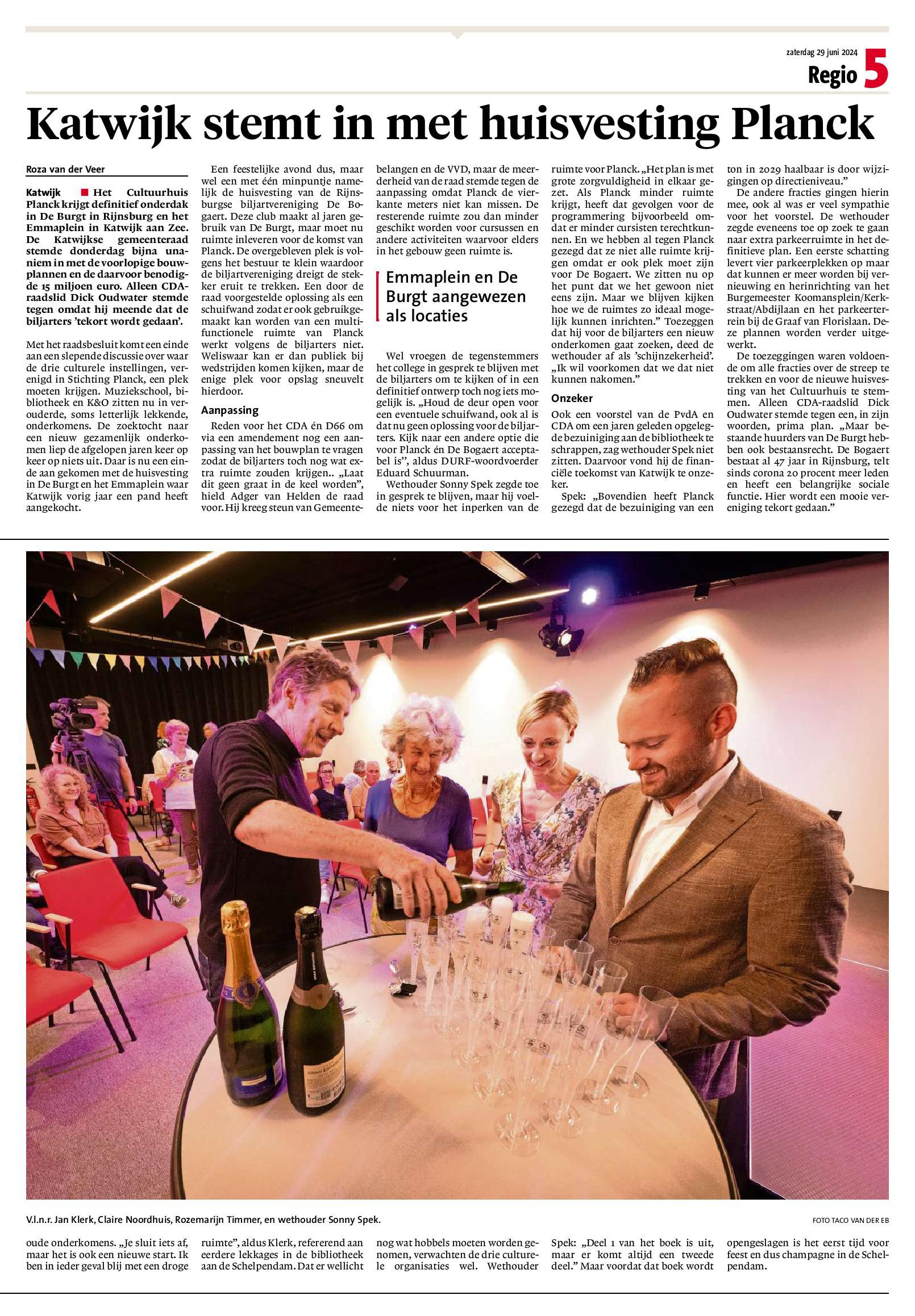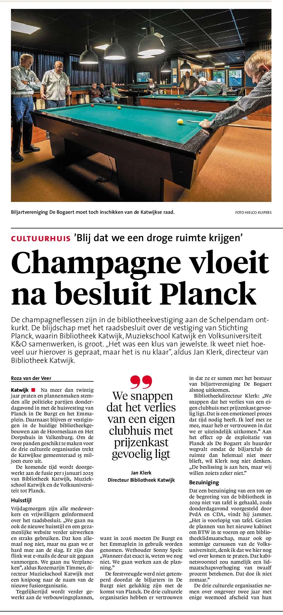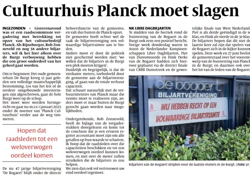 Woensdag 5 juni jl. was er een raadscommissievergadering over de huisvesting van Planck in de Burgt. Insprekers mochten precies 120 seconden hun zegje doen, waarna de commissieleden vragen konden stellen. Er was een schril contrast tussen de bijdragen enerzijds van de Planck insprekers namens bibliotheek, muziekschool en K&O, en anderzijds van onze biljartvereniging de Bogaert. Van Planck zijde niets dan lof voor het voorontwerp; een en al jubel. Voor de Bogaert echter zeker geen reden tot juichen. Al onze pogingen om een werkbare ruimte te krijgen zijn ontvangen met argwaan en achterdocht. De wethouder doet het in de media voorkomen alsof het bestuur consequent overvraagt: “Er is een grens aan de betamelijkheid” volgens de wethouder.